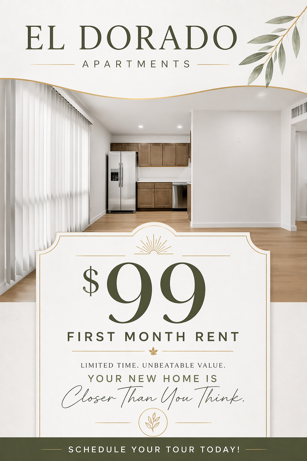 At El Dorado Apartments, marvel at our three spectacular floor plans including studio, one or two-bedroom apartments for rent. Thoughtfully designed features provide you with comfort and convenience. Appointed with a wide array of highly desirable amenities, our apartment homes include air conditioning, spacious walk-in closets, ceiling fans, microwave, and dishwasher. Plus, utilities are bundled for one convenient flat monthly fee, making it easy to manage your living expenses. Select homes even offer a pantry and a personal balcony or patio.